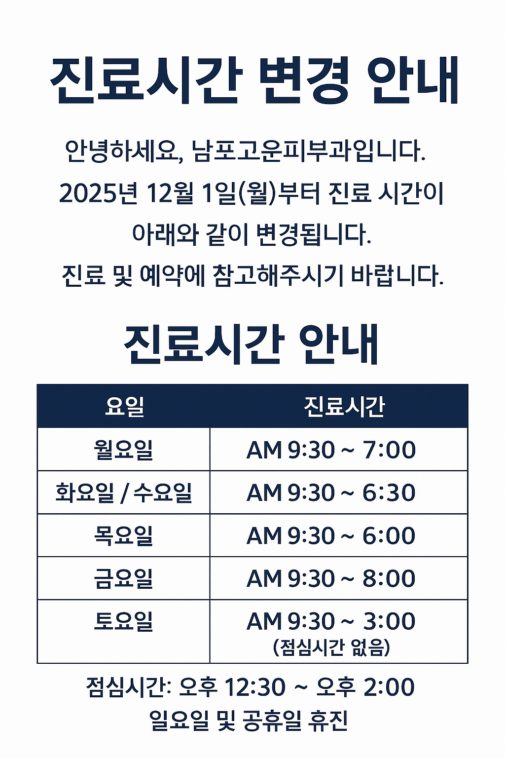 2025년 12월 1일 부터 진료시간이 변경 됩니다.